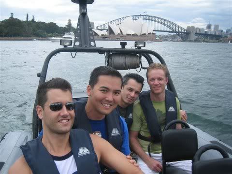 Gav, Keau, Alixx (Seattle) and Rich (NYC) on the powerboat in Sydney Harbour.
